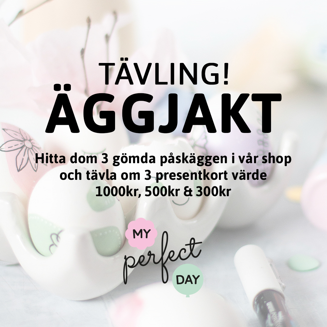 Skicka ett mail till tavling@myperfectday.se och döp det till ?ÄGGJAKT 2021?, skicka sedan länkarna till de tre produkter du där du hittat äggen. Alla tre ägg skall hittas för att ha chansen att vinna! Tävlingen avslutas 5/4 kl. 20:00 och vinnarna kontaktas via mail.