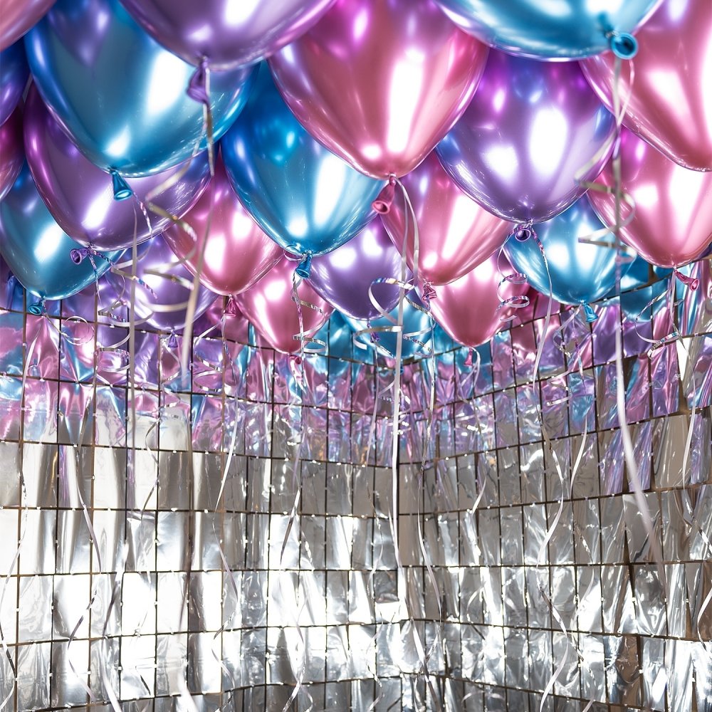 Underbart kit för att dekorera taket med ballonger - skapar otrolig effekt i ett rum. Detta är ett specialkit framtaget med chromeballonger, vilket gör att du får en skimmer på ballongtaket som känns extra festligt. Vill du att ballongerna svävar själv fyller du dessa med helium - annars fäster du ballongerna i taket med medföljande glue dots.