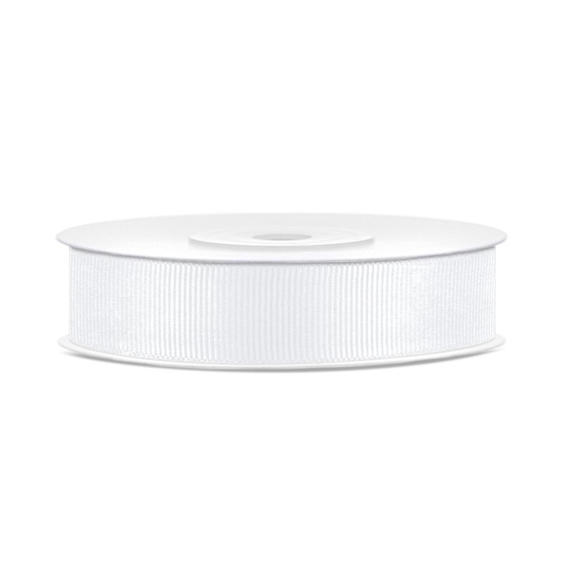 Rulle med 25 m band i vitt grosgrain. Bandet är 15 mm brett.