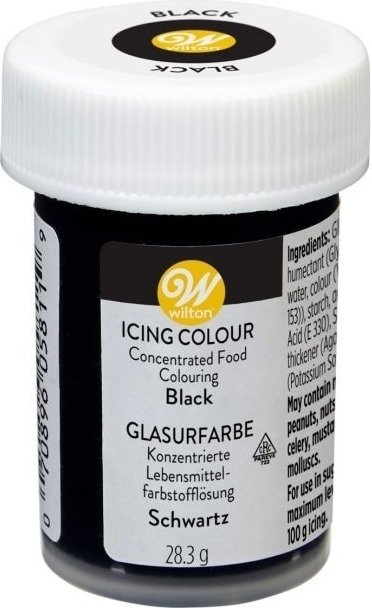 Med Wiltons ätbara färger färgar du enkelt allt från sockerpasta/fondant till smörkräm, enchanted cream, marsipan, glasyr eller kaksmet!Innehåller högkoncentrerad svart färg.Gör så här:Använd en tandpetare eller annan sticka för att ta ut lite färg från förpackningen. Använd en ren sticka varje gång. Då färgen är väldigt dryg, börja med lite och tillsätt mer om det behövs, tills du uppnått önskad kulör. Knåda eller rör noga mellan varje gång (för en marmorerad effekt på t ex sockerpasta, knåda bara lite!). Fungerar för alla vattenlösliga produkter, ej lämplig för choklad. Ingredienser: glukosirap, socker, glycerol, vatten, färgämne (E153), surhetsreglerande medel (E330), antioxidationsmedel (E331), förtjockningsmedel (E406), konseveringsmedel (E202). Kan innehålla spår av mjölk, soja, vete, jordnötter, nötter, fisk, selleri, kräftdjur, senap och blötdjur.