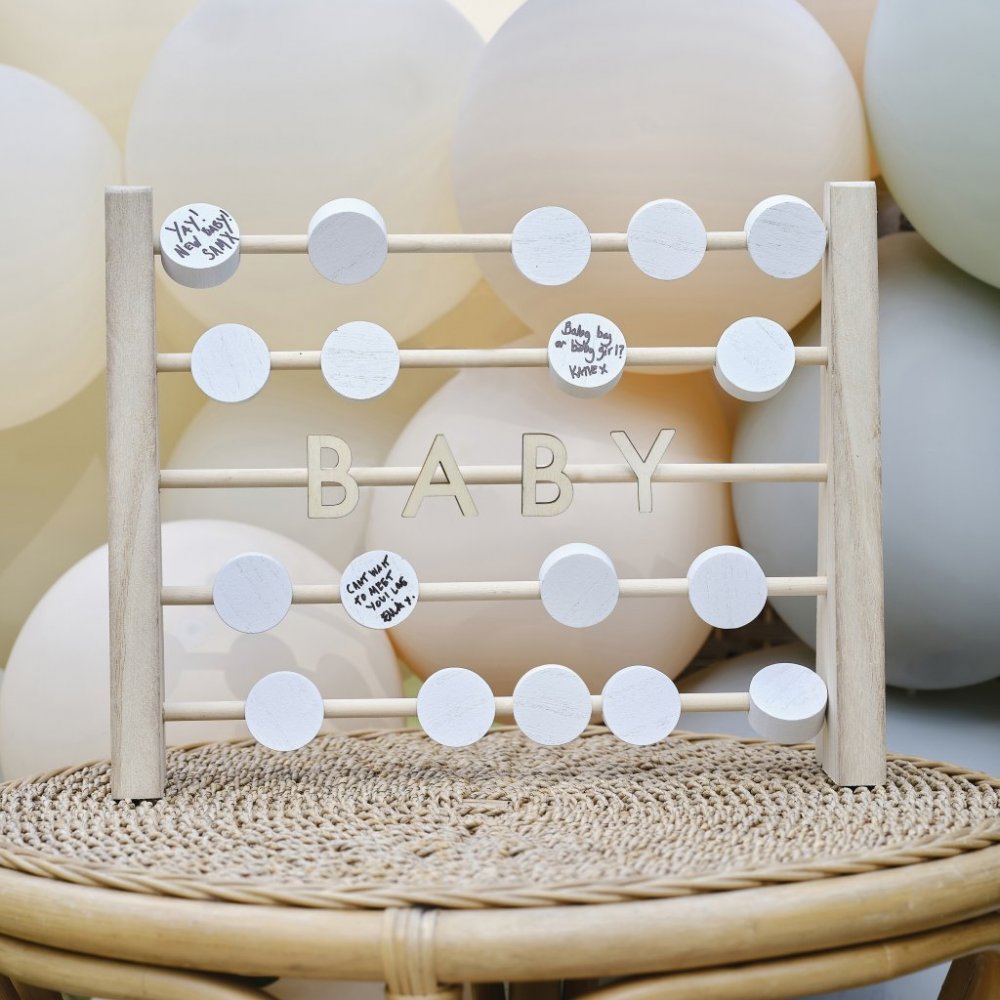 Superfin "alternativ gästbok" till baby showern eller dopet - kulram i trä med cirklar att skriva meddelanden på för gästerna.