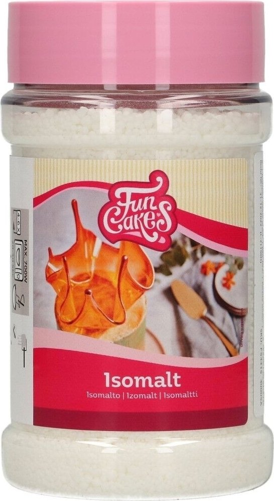 Skapa vackra tårtdekorationer med FunCakes Isomalt - tillverka klara ädelstenar, fönster till exempel för pepparkakshus, mosaiker mm. Isomalten kan värmas utan att förlora sin sin söta smalk eller ändra färg.Extremt lämplig för smältning och omformning. Kan användas som sötninsgmedel - inte lika söt som socker, blandas med fördel tillsammans med andra sötningsmedel.Ingredienser: Isomalt (100%)Innehåll: 250 gram.Användning : Smält i mikrovågsugn (ca 700W i en värmetålig skål) eller i en panna upp till 170°C. Rör om isomalten var 20-30sekund tills den är helt smält. Sätt skålen/pannan i en skål med en liten mängd kallt vatten i ca 10 sekunder. Isomalten är nu tempererad och du kan färga och bearbeta den som du önskar. VARNING!: Den smälta isomalten är mycket varm!