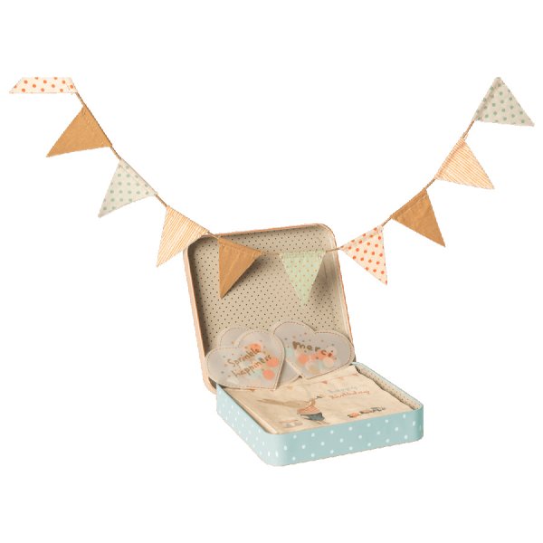 Superfin box med dekorationer och 16-pack servetter för kalaset i Maileghuset (eller ert eget). Minivimpel och konfetti samt kaffeservetter.