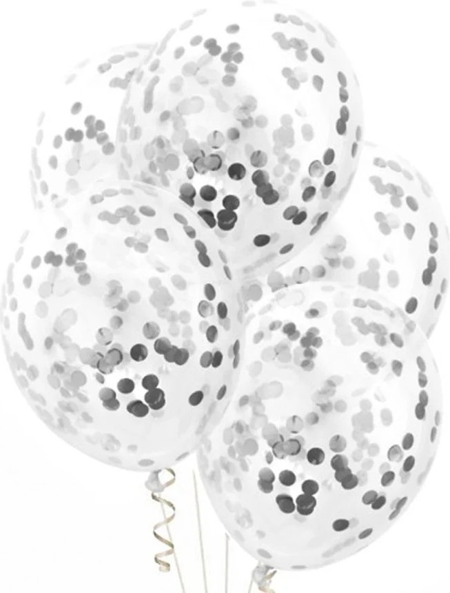Fina konfettiballonger med silverkonfetti. Innehåller 4 st ballonger. Ballongerna blir ca 30 cm upplåsta. Kan blåsas upp med luft eller helium.