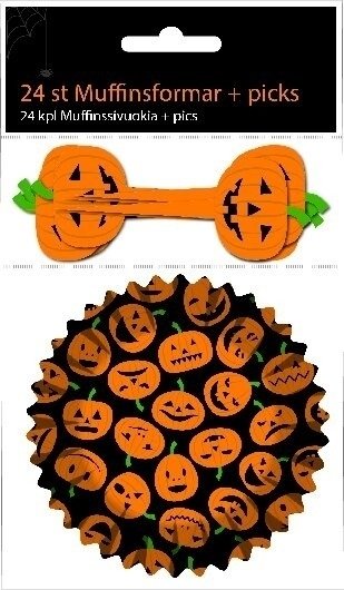 Muffinsformsar i härliga halloweenfärger med pumpamönster, samt fina matchande cake picks med pumpor. Förpackningen består av 24 muffinsformar och 24 picks-