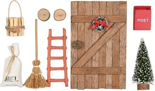 Nissedörr med flera tillbehör, perfekt för nissens inflytt. Innehåller dörr, mjölsäck, trähink, stege, kvast, gran, två krokar och en brevlåda.