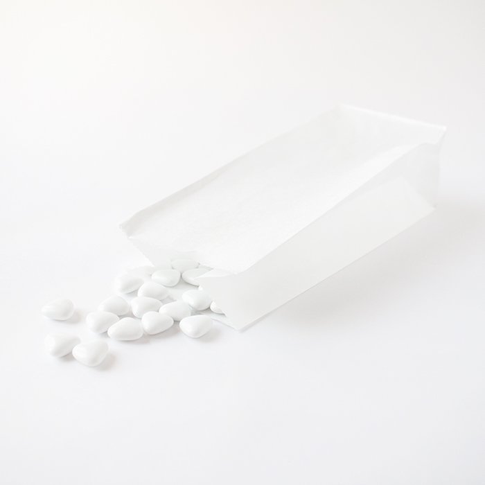 10 stycken godispåsar i vitt papper. Påsarna är 10x6x24 cm