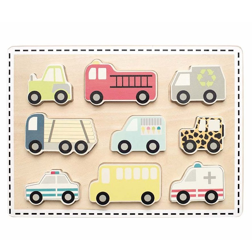 Fint träpussel med 9 olika fordon. Greppvänliga för små hänger och figurerna är även roliga att leka med.