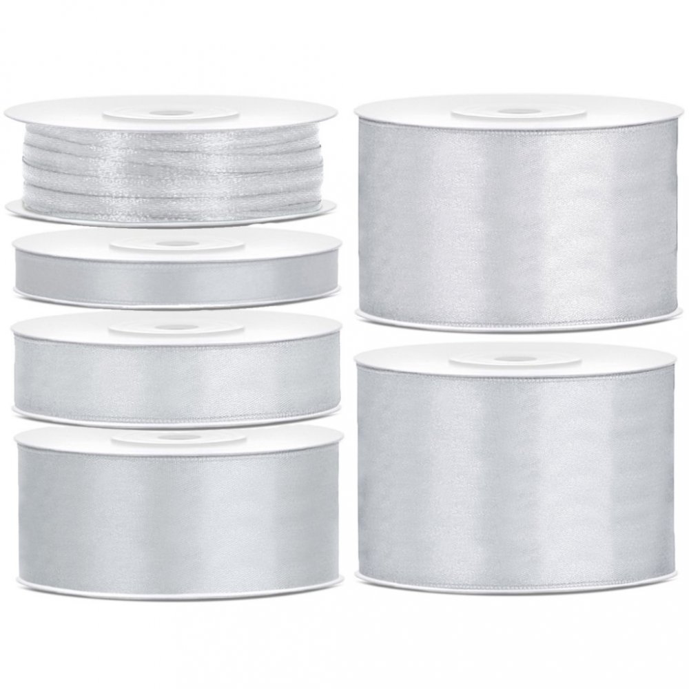 Satinband i silver i flera bredder. En rulle består av 25 meter band.