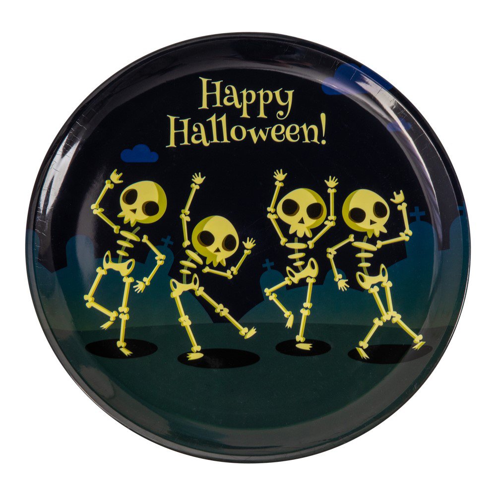Runt serveringsfat i svart med skelett och texten Happy Halloween!.