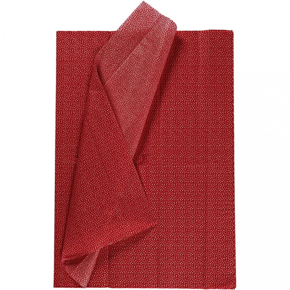 Förpackning med 6 stycken ark genomfärgat, transparent silkespapper i rött med dekorativa, vita prickar.
