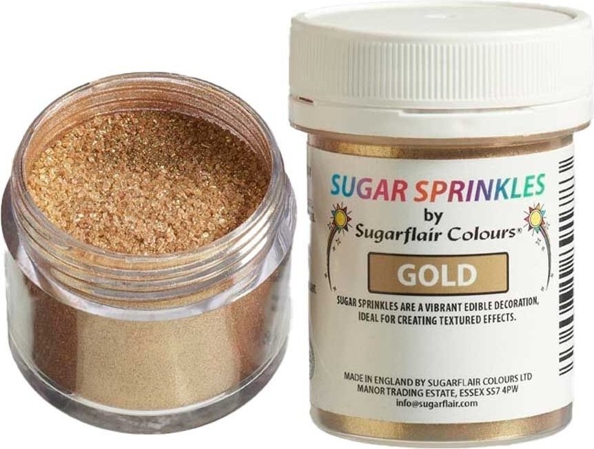 Ssockerkristaller i guld. För dekoration av tårtor, cupcakes, cake pops och andra bakverk.Ingredienser: socker, färgämne (E172), klumpförebyggande medel (E551). Innegåller: 40 gram.Förvaras mellan 8°C - 24°C i torr miljö.