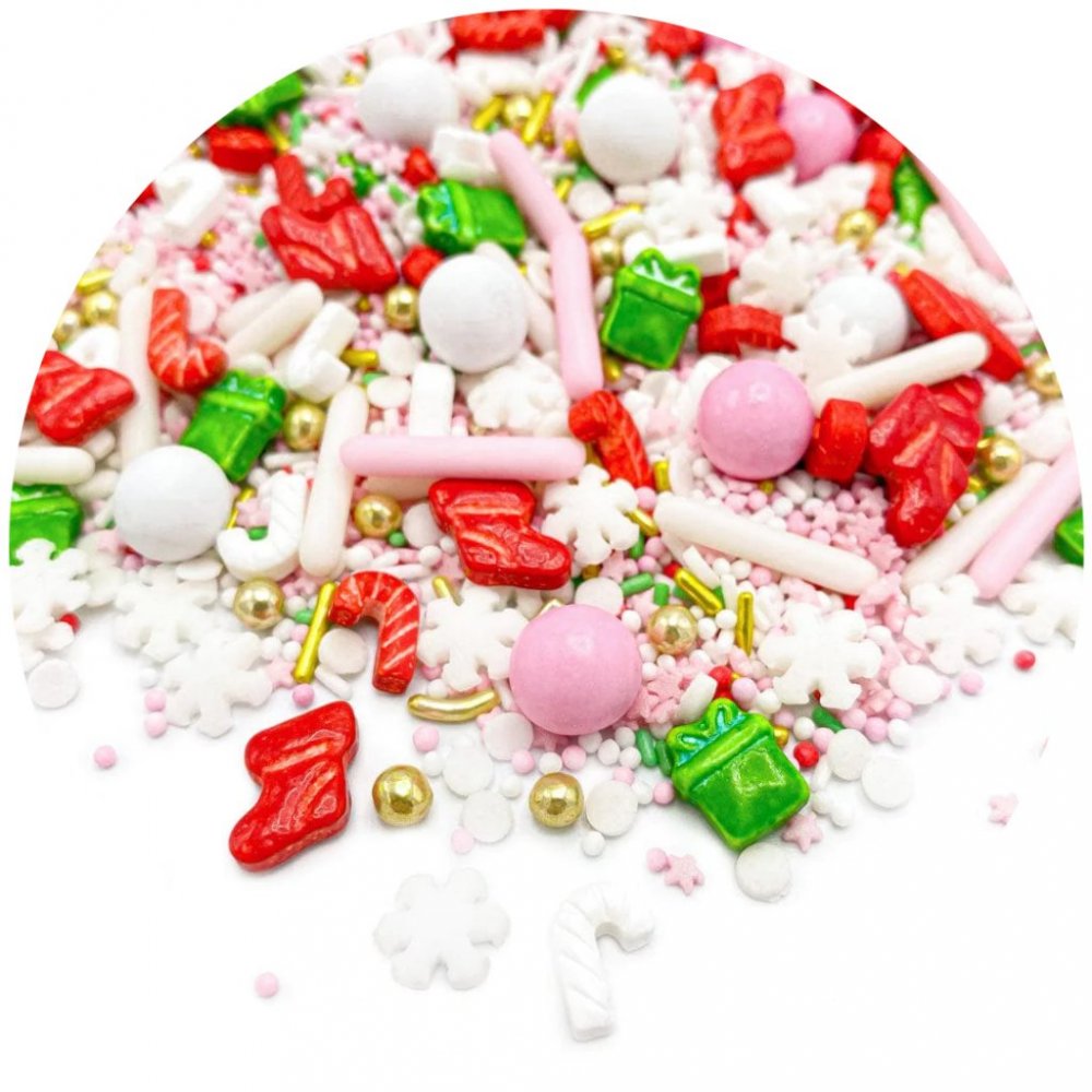 Underbar, julig strösselmix med små polkagrisar, paket och julstrumpor, chokladpärlor och andra härliga strössel i juliga färger.