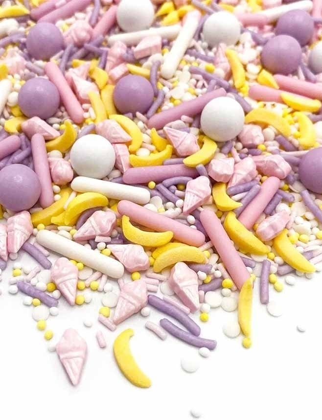 Fin pastellig strösselmix från Happy Sprinkles, med små söta bananer och glasstrutar! I fina vårig färger. Passar till bakverk, eller varför inte strö på en lyxig banana split!