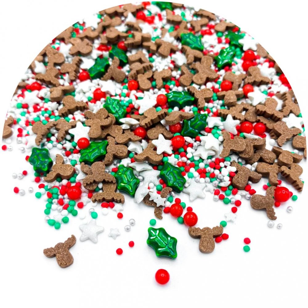 Härlig, julig strösselmix med Rudolf, röda mulen och andra söta och detaljrika strössel.