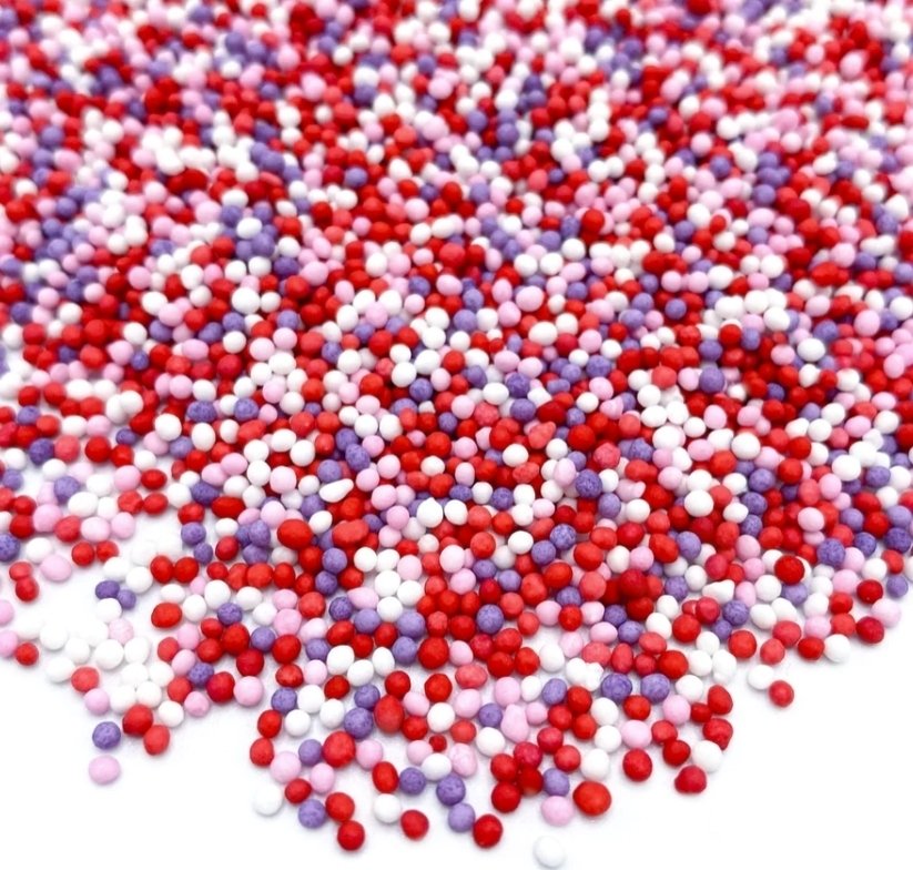En jättefin strösselmix i form av små sockerkulor (nonpareils) i rött, rosa, vitt och lila. Passar perfekt att strö över kakor och bakverk. Ett lite oväntat tips är att använda dem på macarons - det kommer verkligen att bli hur fint som helst!