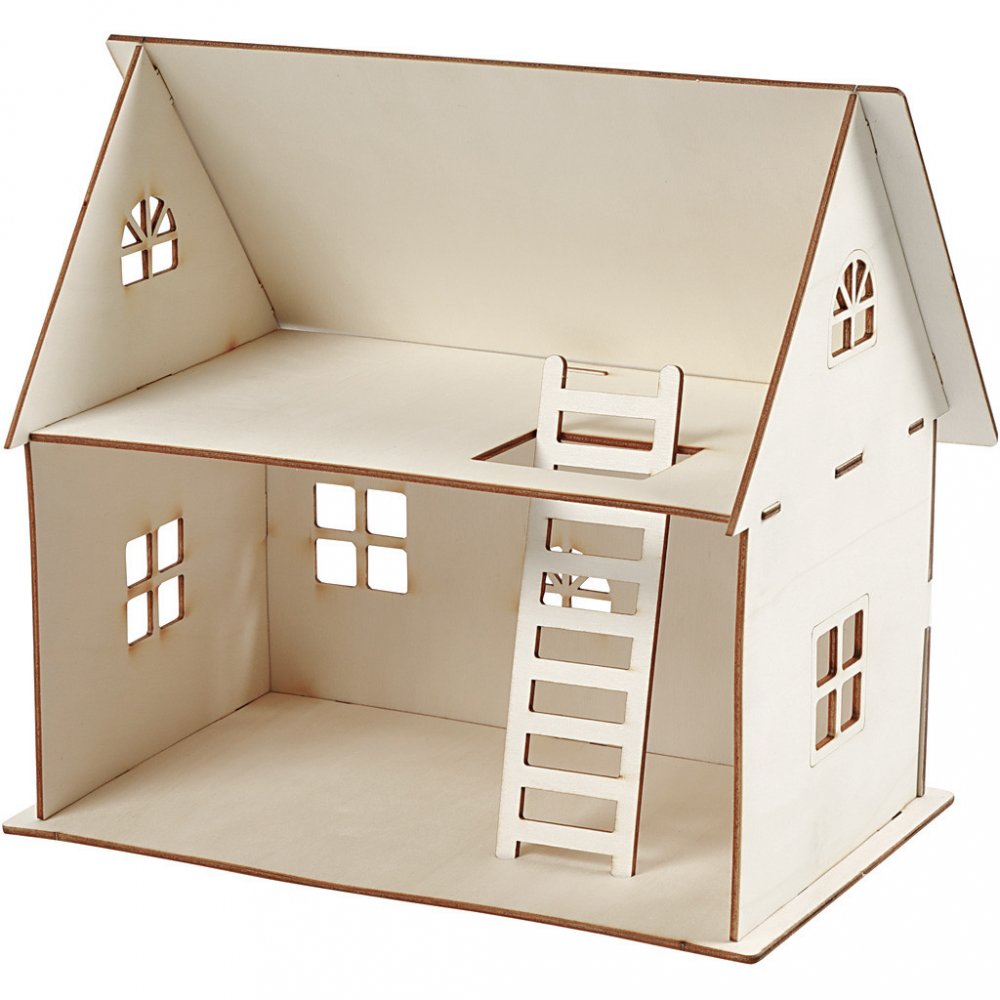 Sött trähus med konturer runt fönster och dörr, öppet på ena sidan och stängt på andra. Supersött som nissehus eller dockskåp. Matcha med våra miniföremål och små möbler.